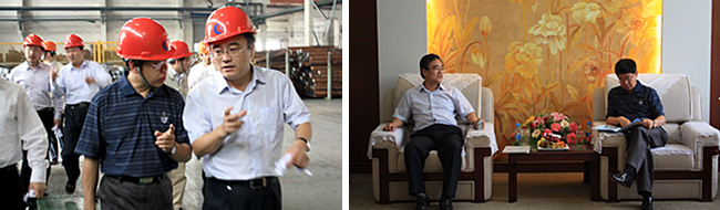 5月26日,新兴铸管集团有限公司刘明忠董事长一行在金坛市经济开发区相关向导的陪同下,来公司视察。公司董事长(总司理)曹坚,副董事长、党委书记陈普安以及执行总司理周家华举行了热情的接待。在曹总等公司向导的陪同下,刘明忠董事长一行视察了热轧分厂、管加工分厂、特殊扣线以及公司样品摆设室。